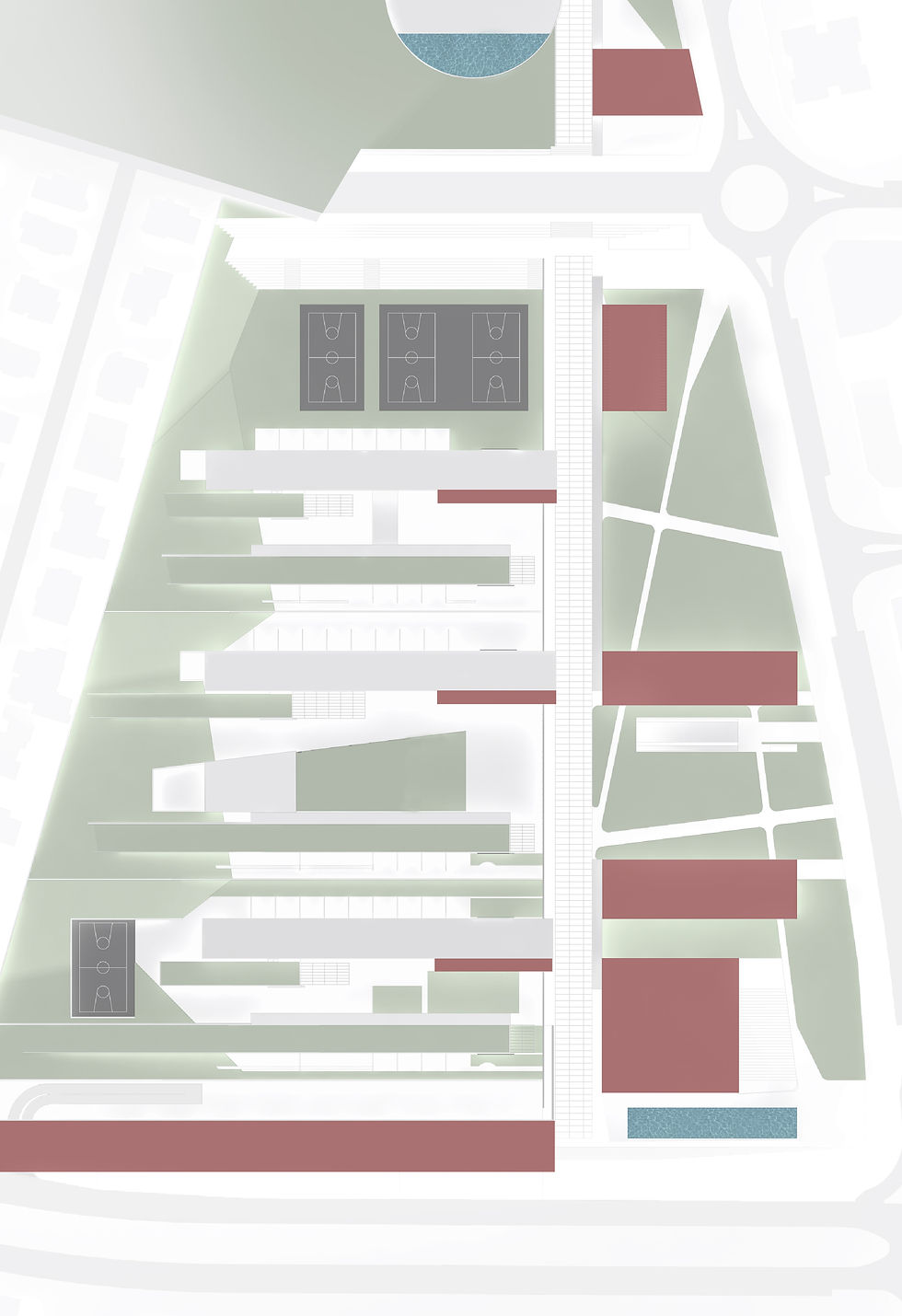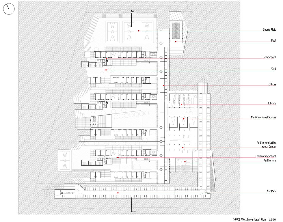 Educational campus – schools which combine formal and non-formal spaces, where children can be, more freely and more independently. The classes allow for group and individual learning and include a private garden for each individual class where they can hold activities. Additionally, the possibility exists to connect classes in order to allow for joint activities. From assembly to observation – the student's experience passes through places of gathering adjacent to the entrance to the promenade, which allow for a more introverted experience, towards quieter and more contemplative spaces which face the green areas which are located along the western wall of the complex. The connection between the auditorium and the school – this connection like the other connections between the public buildings and the school, serve as a central component in the way the complex functions. The auditorium connects to the school's main courtyard through an underground complex which includes a sunken yard, secondary halls and access to the underground parking. One can enter the auditorium from the ground level as well as from the level of the sunken yard and school. Both functions can work together or individually. In a flexible way and according to the user's needs and=d the time of day. A meeting point between different measurement scales – the complex mediates between ground floor housing developments on the west, and future multi story buildings on the East. The western part – includes both schools which are entrenched in the topography and spread their built wings with green spaces in a sort of Mediterranean orchard. The eastern part – includes a continuous green space where the main public spaces stand and face the new neighborhoods and main boulevards.